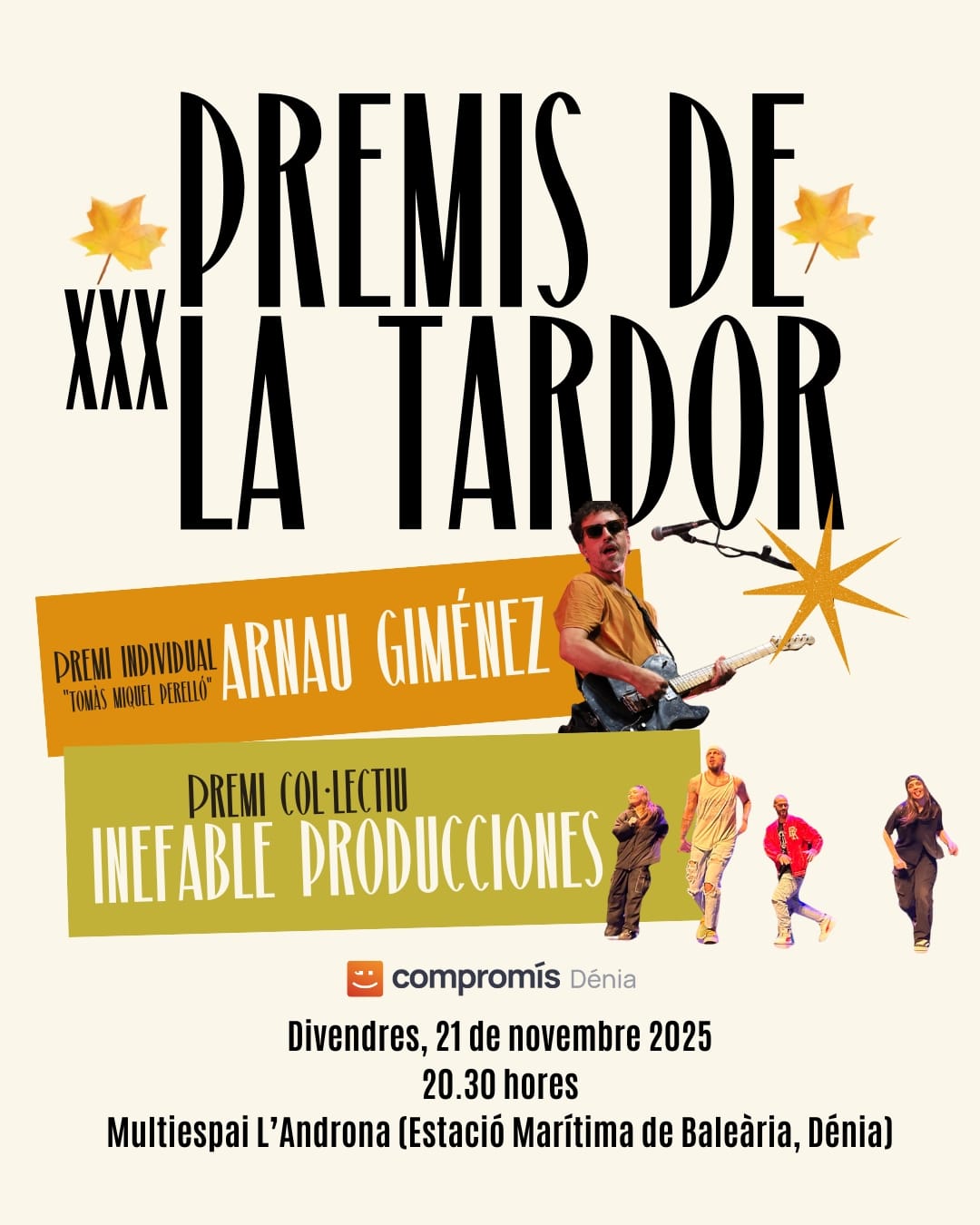 07 de noviembre de 2025 - 12:49 Foto Anterior2 de 2Ver el artículo original: Arnau Giménez e Inefable Producciones, galardonados con los Premis de la Tardor 2025 de Compromís per Dénia Galardonados en los Premis de la Tardor 2025 La música comprometida de Arnau Giménez y el arte educativo de Inefable Producciones, protagonistas de los Premis de la Tardor 2025