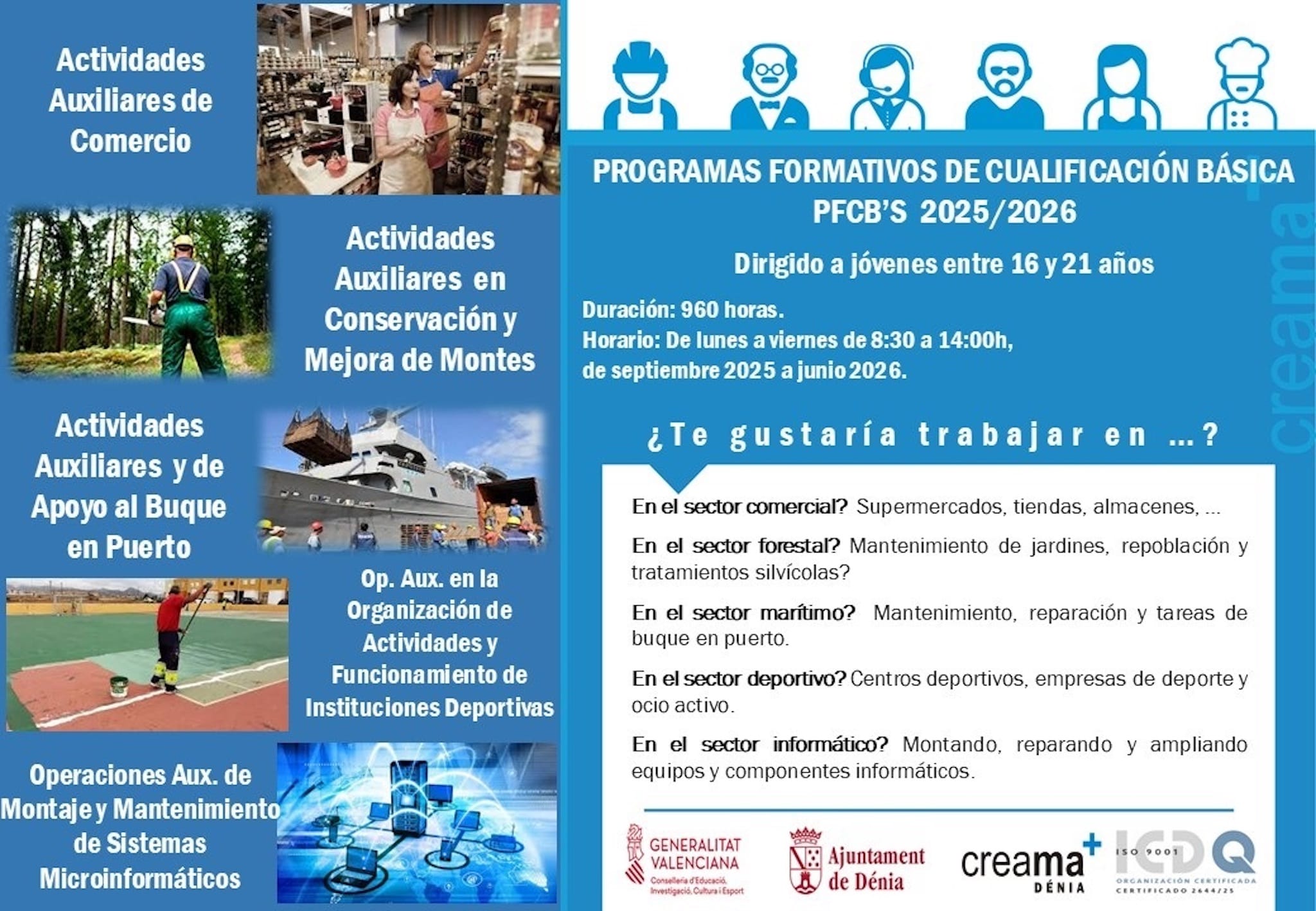 11 de septiembre de 2025 - 14:11 Foto Anterior2 de 3Foto SiguienteVer el artículo original: Así son los programas de formación de Dénia que facilitan empleo a jóvenes Nuevo programa de Limpieza de superficies y mobiliario en edificios y locales, con alta demanda en el mercado, adaptado a personas con un certificado de discapacidad igual o superior al 33% Creama-Dénia abre la matrícula de los Programas Formativos de Cualificación Básica con un nuevo itinerario adaptado a personas con diversidad funcional y cinco programas consolidados Aula de Creama (archivo)