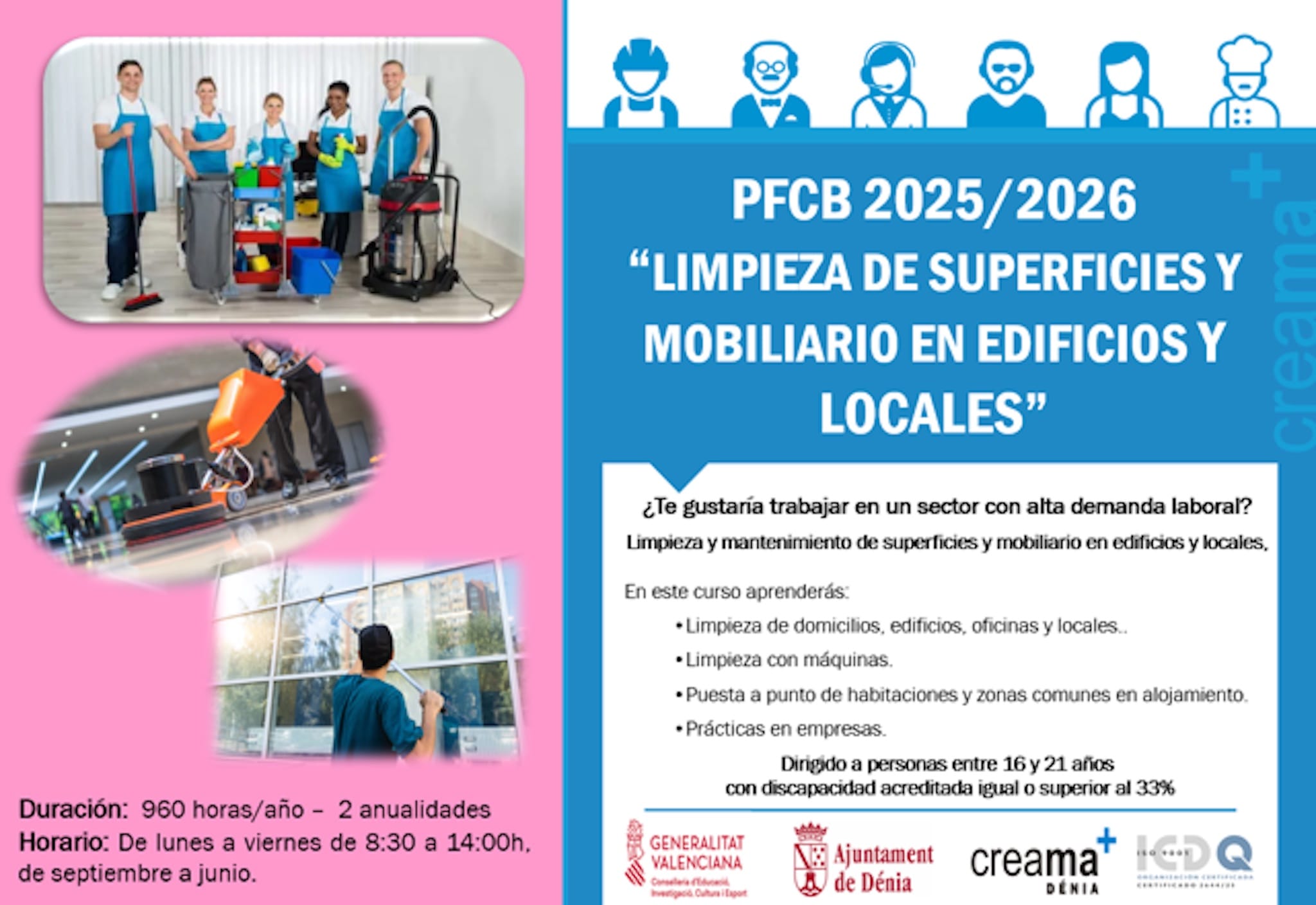 11 de septiembre de 2025 - 14:11 1 de 3Foto SiguienteVer el artículo original: Así son los programas de formación de Dénia que facilitan empleo a jóvenes Nuevo programa de Limpieza de superficies y mobiliario en edificios y locales, con alta demanda en el mercado, adaptado a personas con un certificado de discapacidad igual o superior al 33% Creama-Dénia abre la matrícula de los Programas Formativos de Cualificación Básica con un nuevo itinerario adaptado a personas con diversidad funcional y cinco programas consolidados Aula de Creama (archivo)