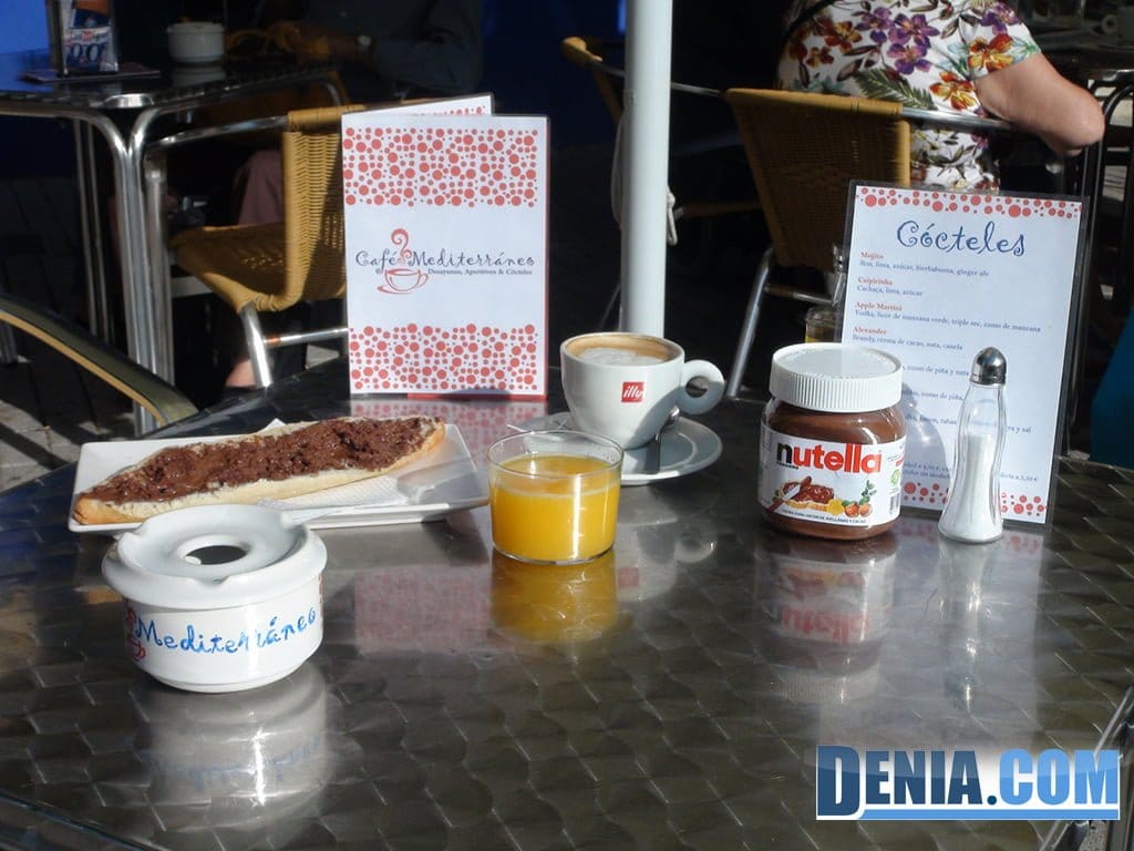 Desayunos con zumo natural de naranja, cafe y tostada de lo que tu la quieras, incluso Nutella en Café Mediterráneo.