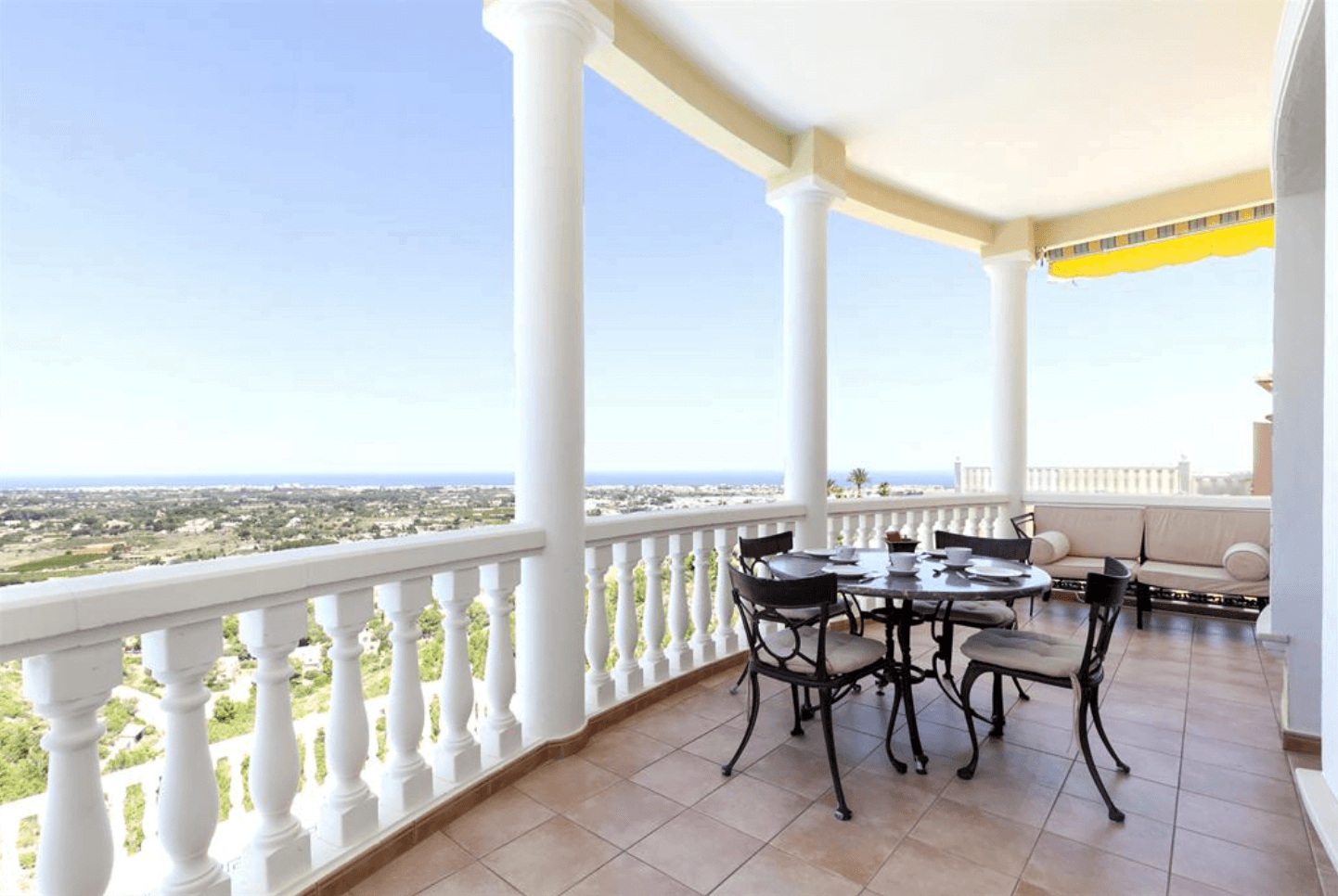 Terraza cubierta con conjunto de exterior compuesto por una mesa redonda y cuatro sillas con vistas al mar.