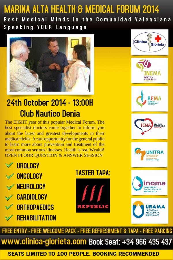 21 de octubre de 2014 - 19:17Cartel del Foro de Salud para personas de habla inglesa. Foto Anterior3 de 6Foto SiguienteVer el artículo original: Clinica Glorieta organiza el Foro 12 de Salud 2014 Fernando De la Guía Clinica Glorieta Cartel en Inglés del Foro de Salud LOGO-CLINICA-GLORIETA LOGOS-CLINICA-GLORIETA Sus dudas médicas serán respondidas