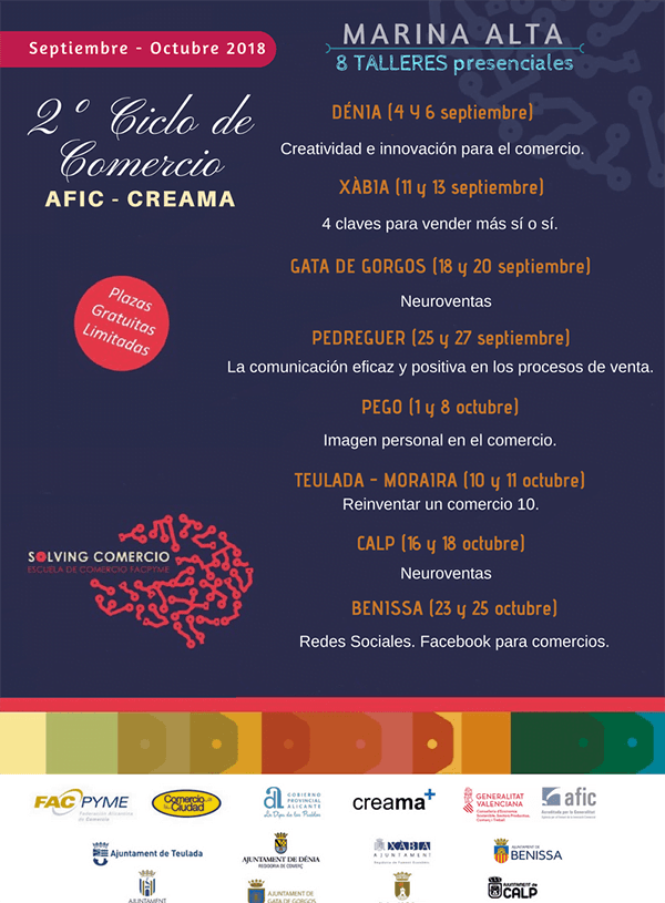 Este ciclo de formación comenzará en Dénia con el taller “Creatividad e innovación en el comercio” el día 4 y 6 de septiembre y acabará en Benissa con el taller “Redes sociales. Facebook para comercios” el día 23 y 25 de octubre. Todos los talleres se realizarán en el mismo horario de 15 a 17 horas, serán gratuitos y las plazas son limitadas.