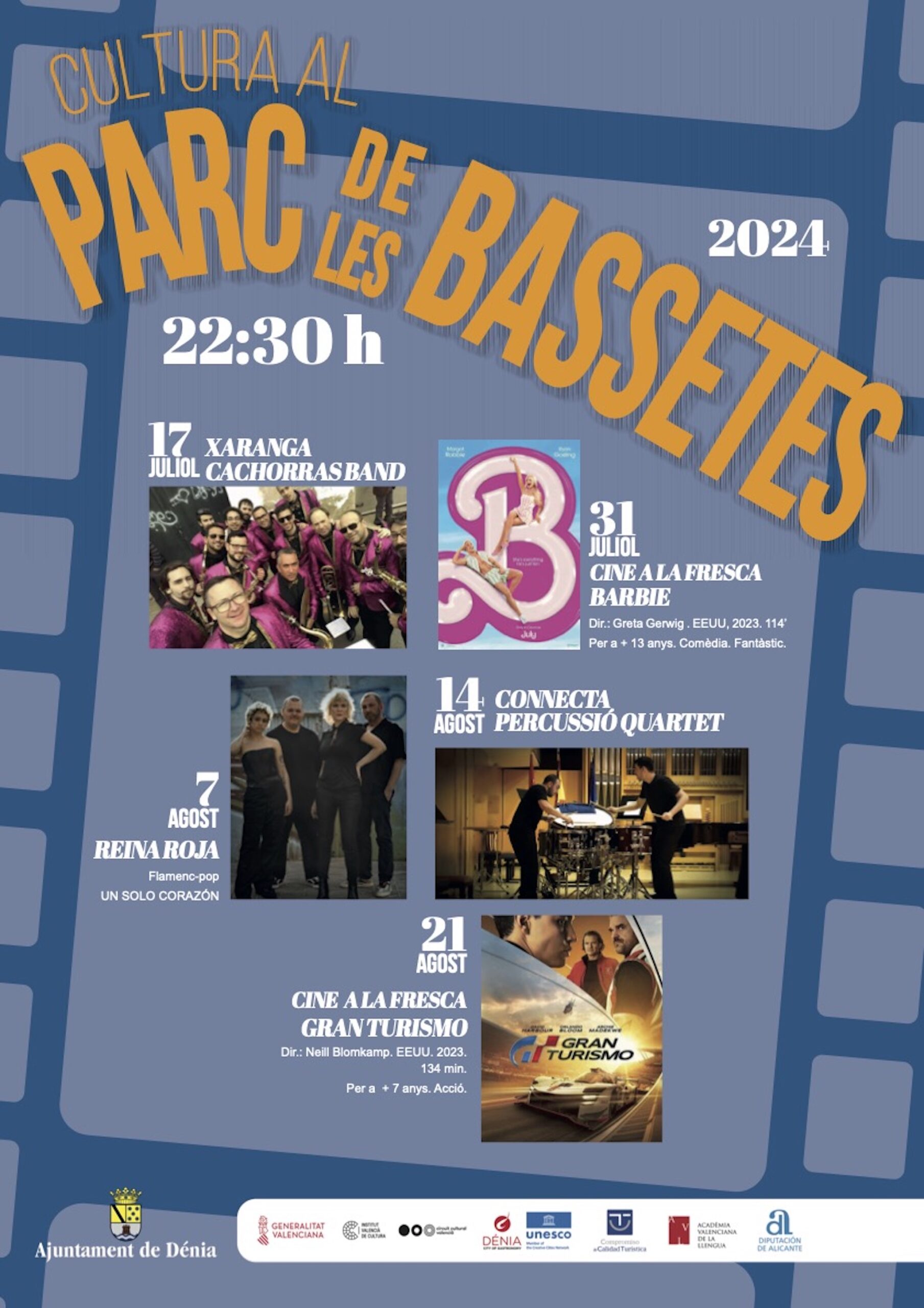 09 de julio de 2024 - 14:00 Foto Anterior2 de 7Foto SiguienteVer el artículo original: Toda la programación cultural del parque Les Bassetes de Dénia de este verano 2024 Actuación de la xaranga Cachorras Band Cartel de Cultura a Les Bassetes 2024 Público en un concierto estival del parc Les Bassetes de Dénia