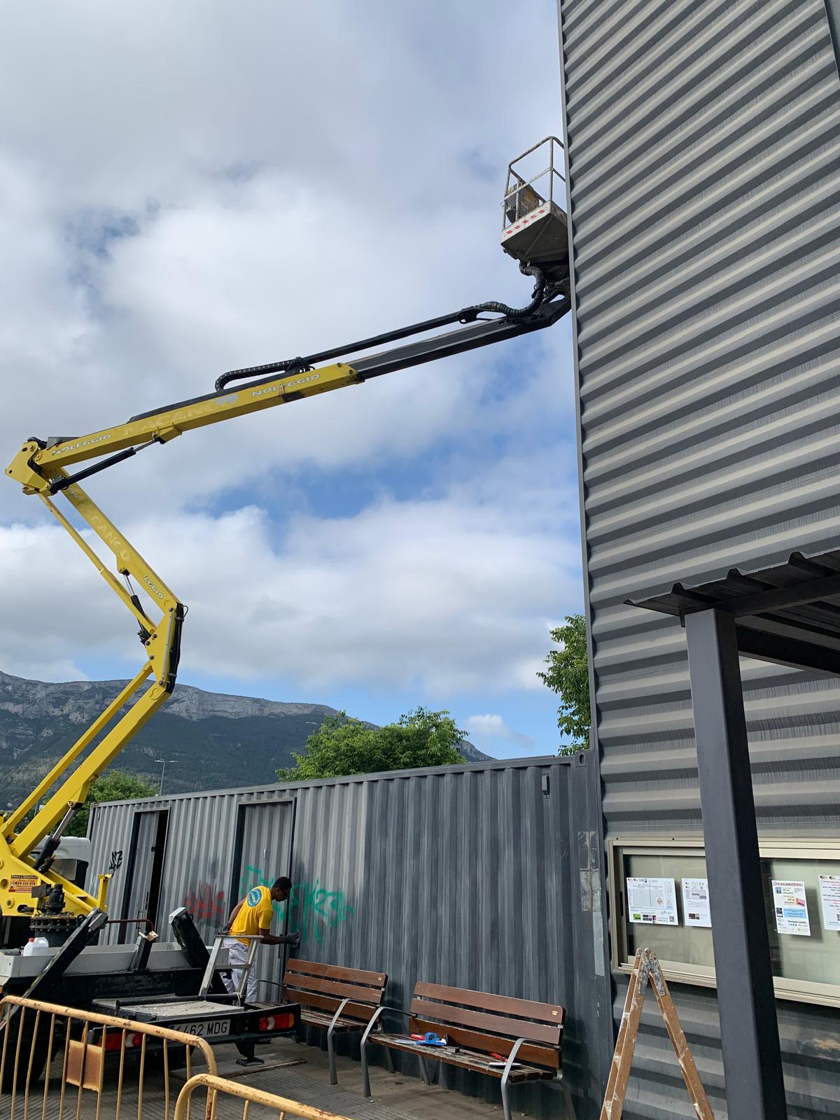 27 de abril de 2026 - 10:47 1 de 2Foto SiguienteVer el artículo original: Dénia lava la cara a su polémica estación de bus Un operario realiza tareas de repintado en la parte superior de la estructura vertical de la estación de autobuses de Dénia Labores de limpieza para eliminar las pintadas vandálicas de los módulos portátiles de la estación provisional