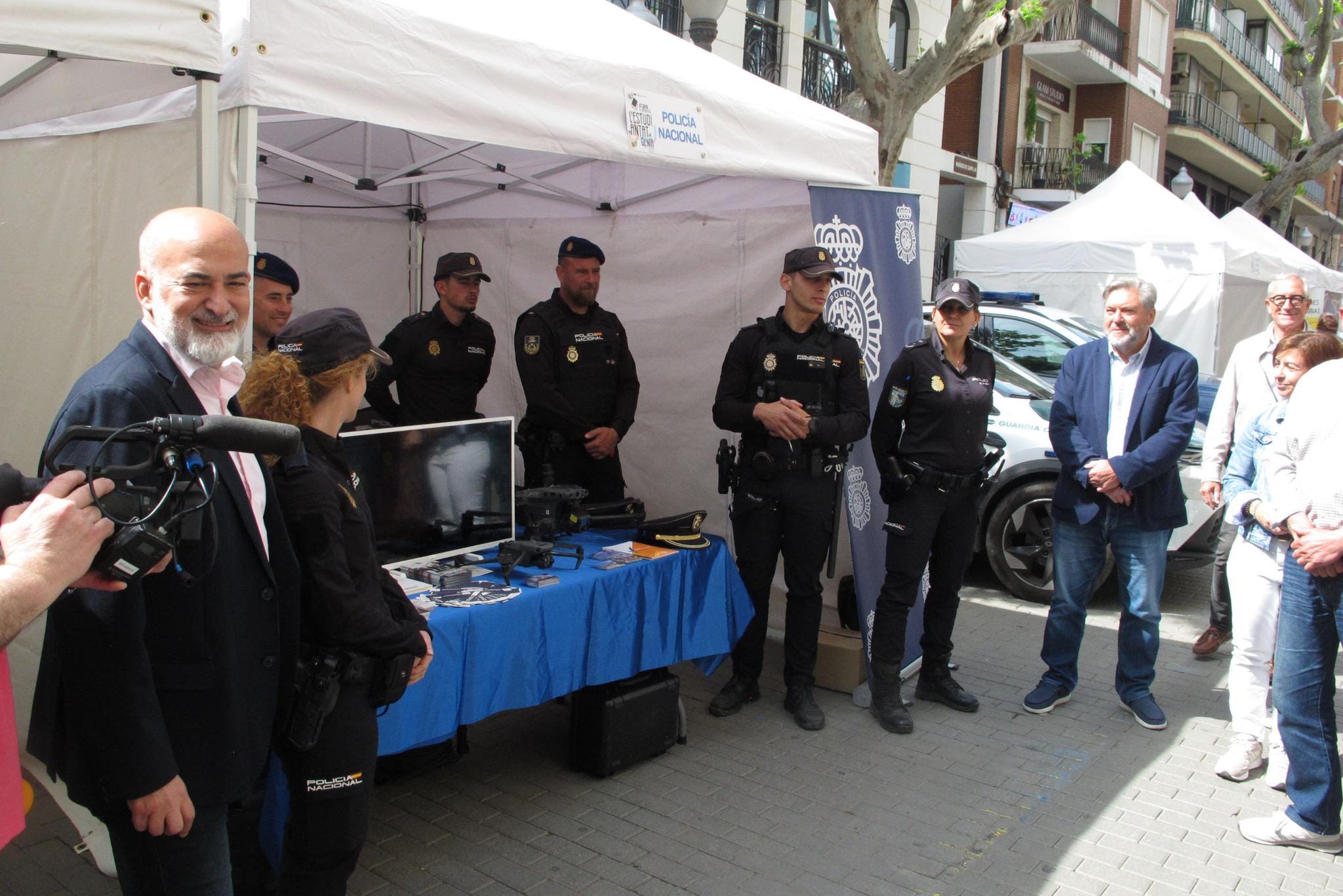 Agentes de la Policía Nacional atienden su stand en la Fira de l’Estudiantat de Dénia, mostrando drones y equipamiento.
