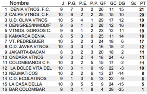 Después de haberse disputado la jornada 10, se ha situado como líder el conjunto del Dénia Vtnos que tras ganar al CD Ecolatinos por 5 a 0. El choque disputado en el campo Diego Mena, estuvo controlado por los dianenses que poco a poco fueron ampliando su ventaja en el marcador para acabar con una “manita” a su rival.