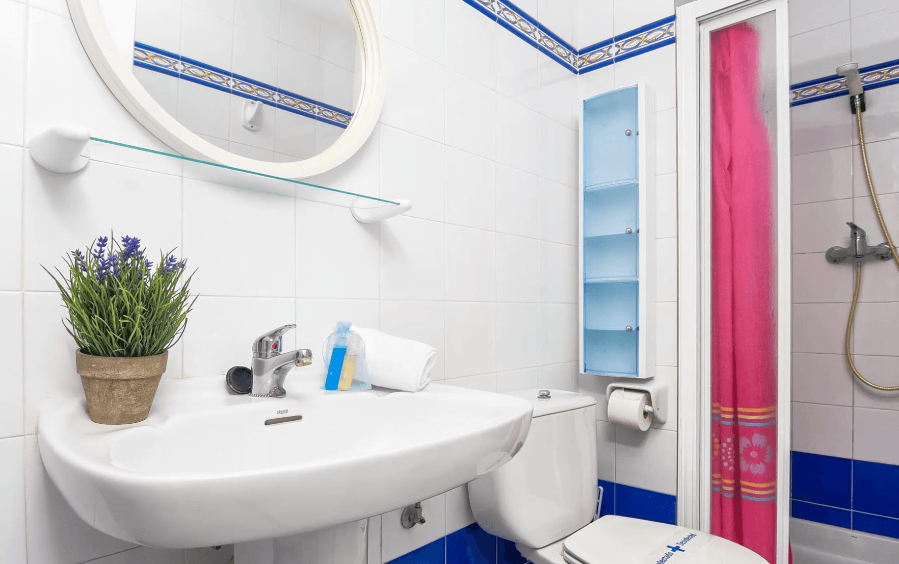 Baño equipado con ducha con mampara.