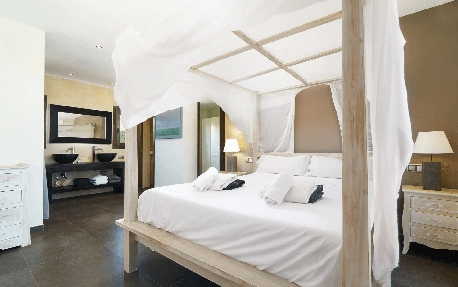 Dormitorio rústico con cama con dosel y baño en suite. Cómodas restauradas con un acabado vintage.
