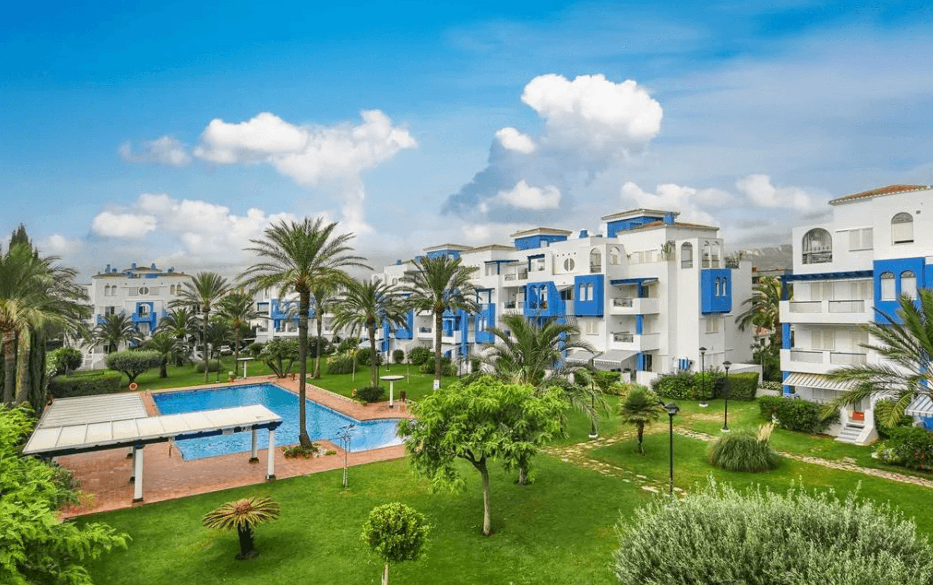El apartamento cuenta con un bonito jardín con árboles y una gran piscina comunitaria, ideal para los meses de verano.
