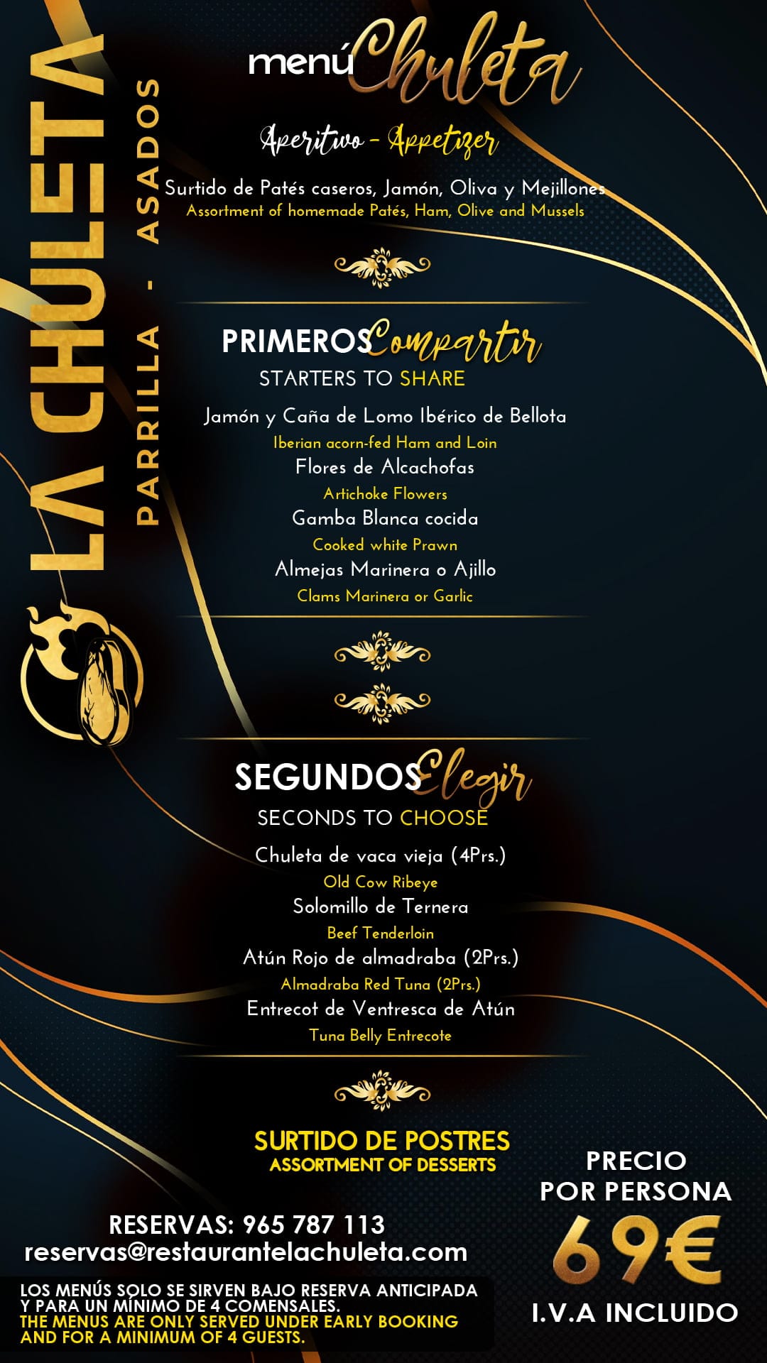 23 de noviembre de 2021 - 11:34 1 de 4Foto SiguienteVer el artículo original: Disfruta estas Navidades con los menús para grupos que La Chuleta ha creado para ti Menú Chuleta por 69€ – La Chuleta Menú Grill por 29€ – La Chuleta Menú mar y montaña por 49€ – La Chuleta Menú matanza por 39€ – La Chuleta