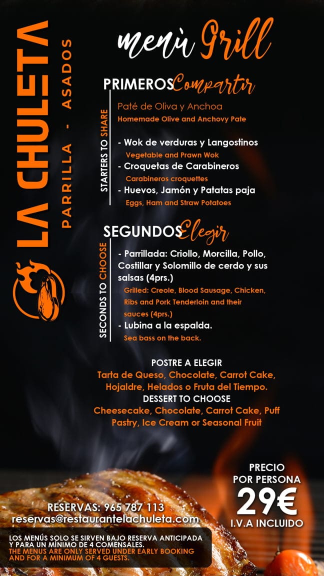 23 de noviembre de 2021 - 11:34 Foto Anterior2 de 4Foto SiguienteVer el artículo original: Disfruta estas Navidades con los menús para grupos que La Chuleta ha creado para ti Menú Chuleta por 69€ – La Chuleta Menú Grill por 29€ – La Chuleta Menú mar y montaña por 49€ – La Chuleta Menú matanza por 39€ – La Chuleta