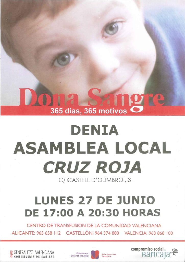 Como cada mes, la asamblea local de Cruz Roja Dénia organiza una nueva jornada de donación de sangre. Será hoy lunes, 27 de junio, de 17 a 20:30 horas.