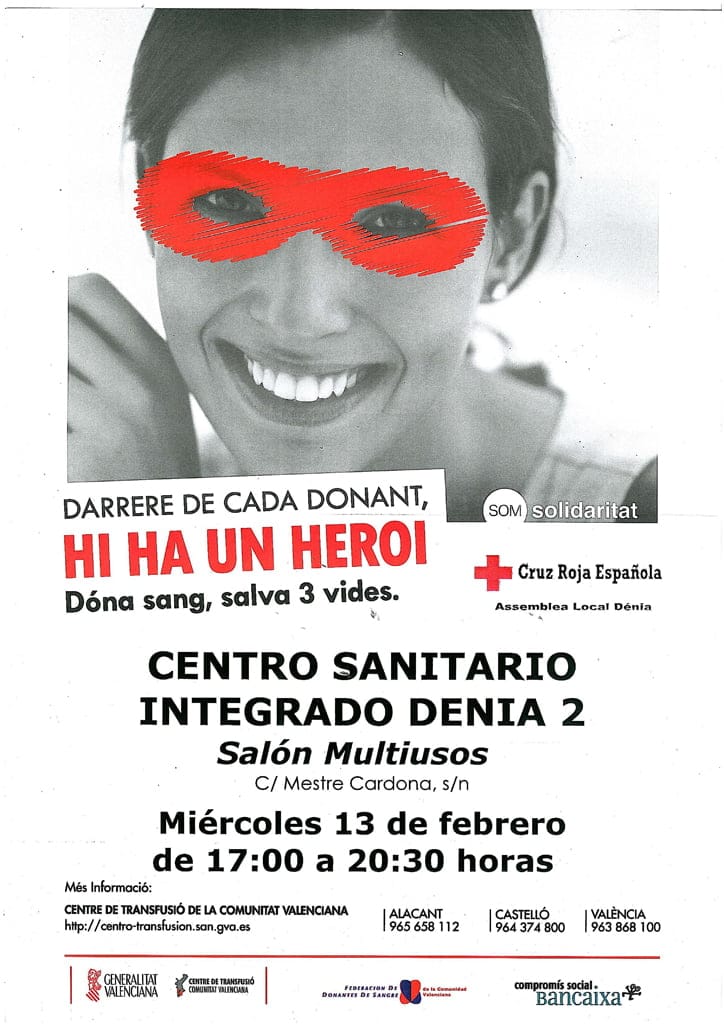 El miércoles 13 de febrero, de 17 a 20:30 horas se celebrará una jornada de donación de sangre en el Centro de Salud de Dénia. Será en la Sala Multiusos y está organizada por el Centro de Transfusiones de Alicante y la Asamblea Local de Cruz Roja en Dénia.