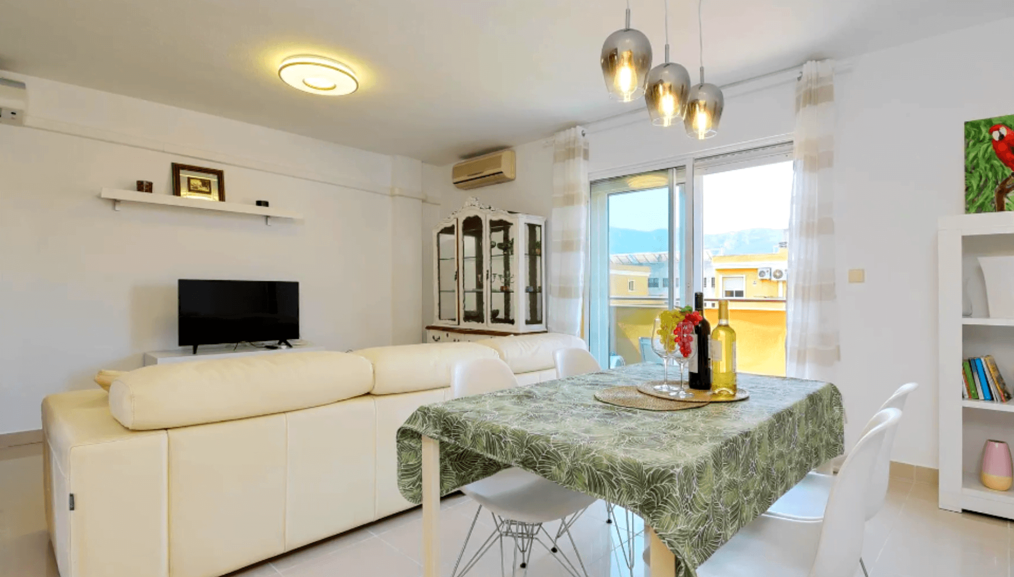 Comedor moderno iluminado por luz natural compuesto por mesa y sillas para 4, sofá y aire acondicionado