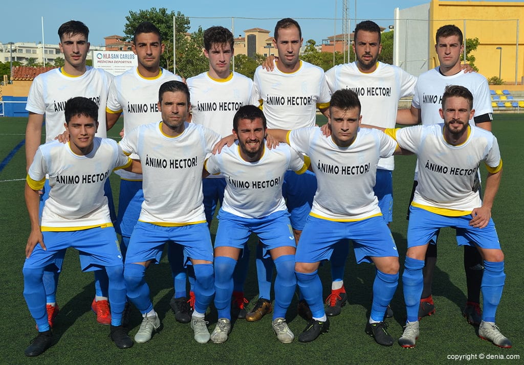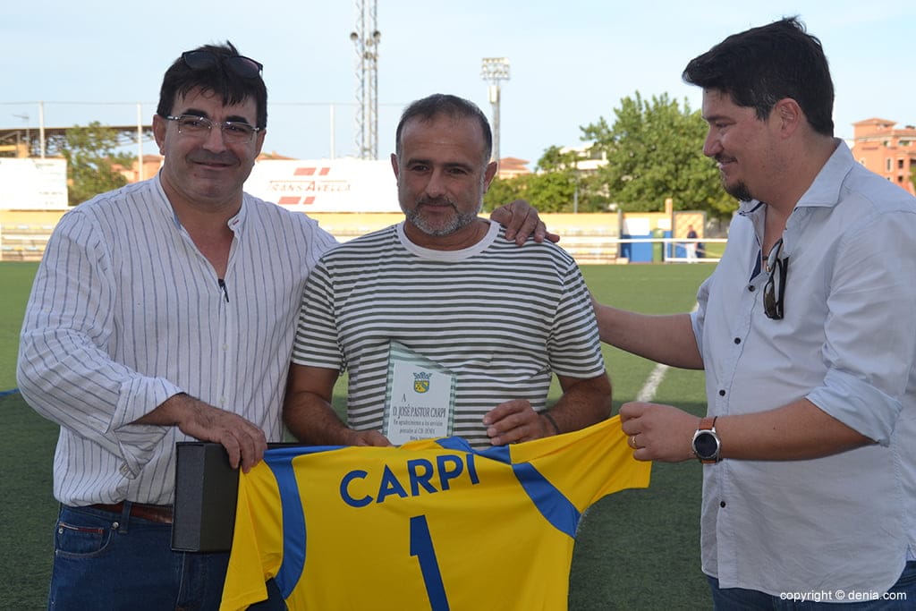 La directiva en funciones del CD Dénia rindió un reconocimiento a Pepe Carpi, quien durante muchos años ha trabajado intensamente para el conjunto groguet. A Carpi, el presidente en funciones, Juan Benavente, le entregó un obsequio de recuerdo de su paso por el club y una camiseta del equipo con su nombre. El público le tributó la ovación de la tarde.