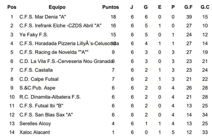 El CFS Dénia Mar sumó su sexta victoria consecutiva al vencer al Calpe Futsal por 5 a 2, en el derbi de la Marina Alta, del grupo XV de la Tercera División de Fútbol Sala. Su máximo rival el Ye Faky FS de Cocentaina cayó derrotado en su propia pista ante el