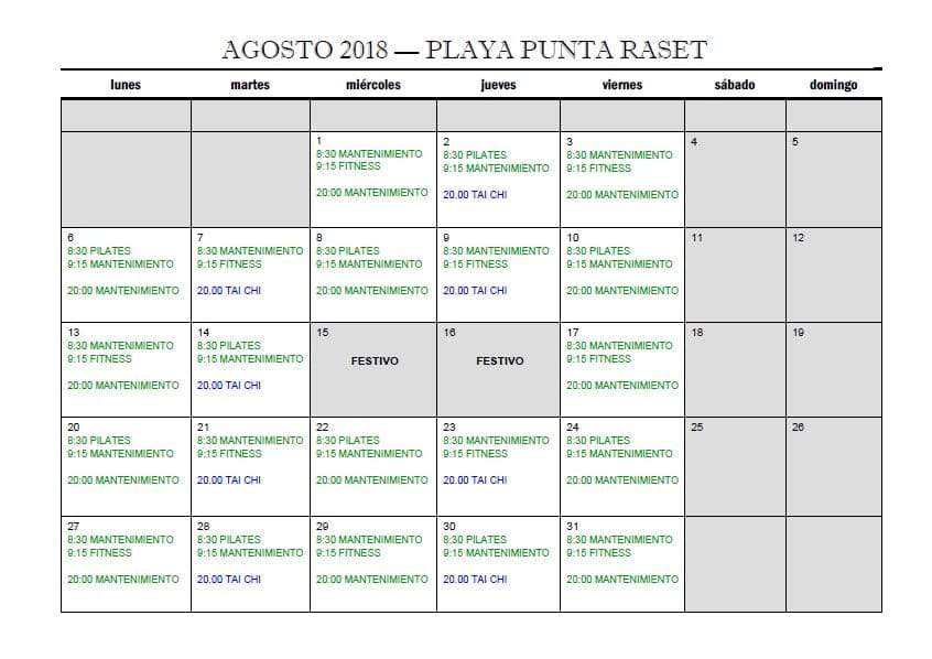 21 de junio de 2018 - 15:06 1 de 5Foto SiguienteVer el artículo original: El deporte gratuito vuelve a las playas de la Marineta y la Punta del Raset este verano Horarios Deporte en la Playa Agosto 2018 – Punta del Raset Horarios Deporte en la Playa Agosto 2018 – Marineta Cassiana Horarios Deporte en la Playa Julio 2018 – Punta del Raset Horarios Deporte en la Playa Julio 2018 – Marineta Cassiana Deporte en la playa
