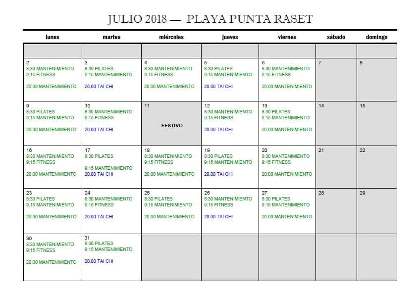 21 de junio de 2018 - 15:06 Foto Anterior3 de 5Foto SiguienteVer el artículo original: El deporte gratuito vuelve a las playas de la Marineta y la Punta del Raset este verano Horarios Deporte en la Playa Agosto 2018 – Punta del Raset Horarios Deporte en la Playa Agosto 2018 – Marineta Cassiana Horarios Deporte en la Playa Julio 2018 – Punta del Raset Horarios Deporte en la Playa Julio 2018 – Marineta Cassiana Deporte en la playa