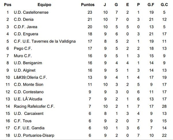 Con esta victoria el CD Dénia se queda segundo en la clasificación a dos puntos de la UD Castellonenses y con uno de ventaja sobre el CD Jávea, equipo que será el próximo rival el domingo, en el campo Diego Mena, en el derbi comarcal por excelencia. El Pego CF se queda en una cómoda sexta plaza con 17 puntos.