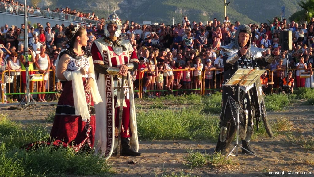 Capitán y abanderada cristianos junto a su embajador durante la llegada de las tropas moras.