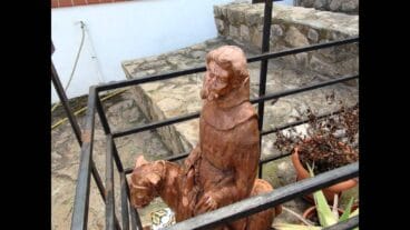 Una imagen del Pare Pere montado en su burrito, hecha en barro, en los exteriores de la ermita.