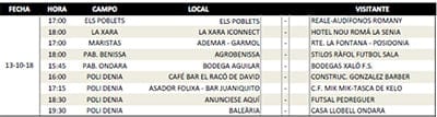 La Xara Innconect sigue su paso firme y goleó a domicilio a Bar Apetitoso por 4 a 8. En el duelo entre equipos de Ondara, la victoria fue para el B Aguilar que venció a Casa Llobell por 1 a 3. Ademar, se impuso a Folixa por 4 a 1. Mientras que B Xaló sacó adelante su partido ante Els Poblets con una triunfo por 3 a 1.