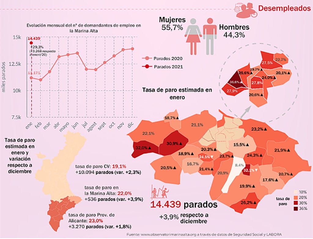 15 de febrero de 2021 - 09:31 1 de 2Foto SiguienteVer el artículo original: En la Marina Alta se pierden un tercio de empleos en el primer mes del llamado “año de la recuperación económica” Desempleo en la Marina Alta en enero de 2021 Afiliaciones y contratos en la Marina Alta en enero 2021