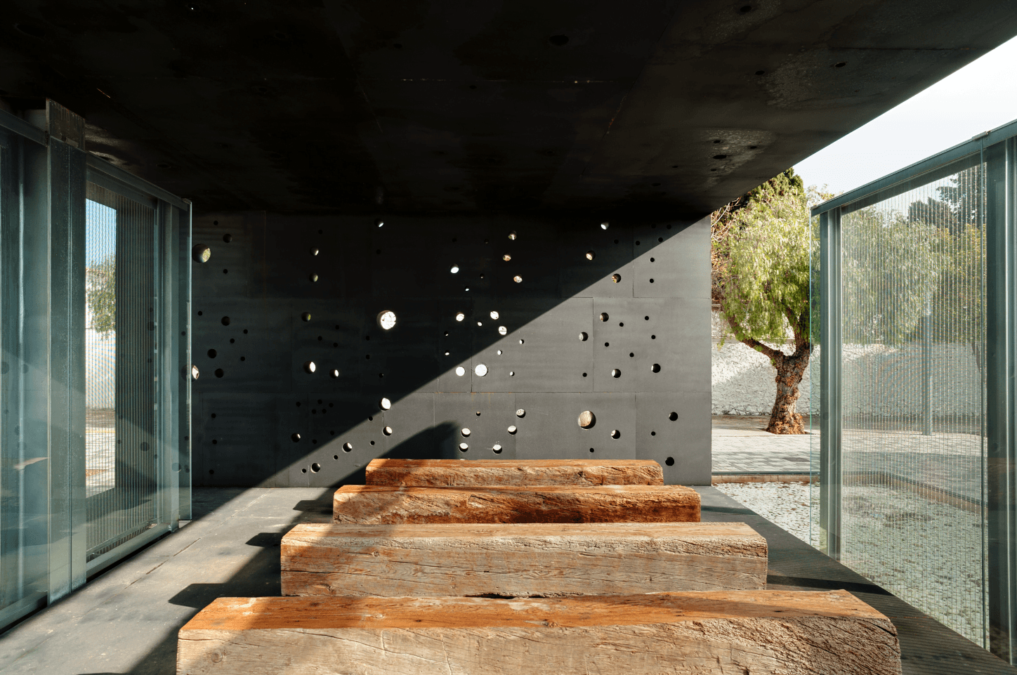 A través de las perforaciones de la pared, se permite el paso de la luz, creando un ambiente de constelación diminuta alrededor de los dolientes.