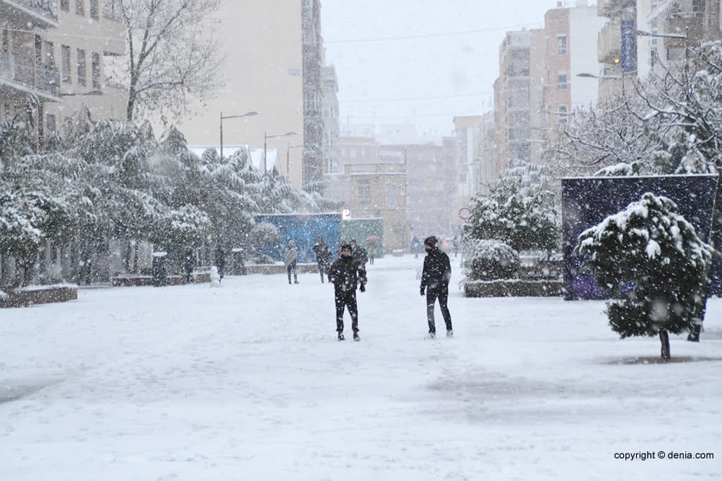 Gente disfrutando de la nieve en calle La Vía