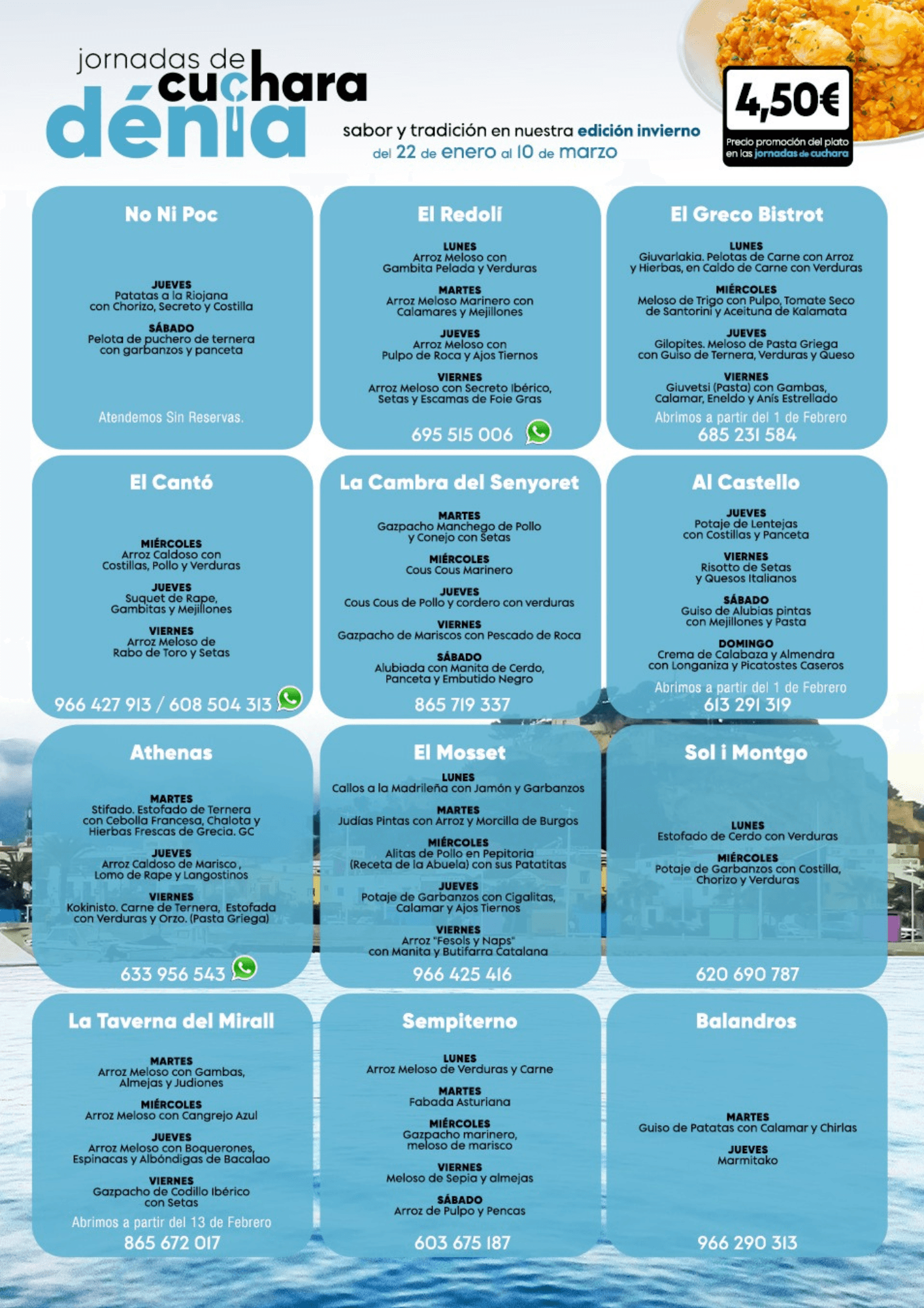18 de enero de 2024 - 11:12Grandes platos de grandes restaurantes elaborados con los mejores productos 1 de 8Foto SiguienteVer el artículo original: Estos son los platos más populares de las Jornadas de Cuchara de Dénia Conoce los platos de estas jornadas de los diferentes restaurantes de Dénia Jornadas de cuchara de Dénia de invierno en 2024 Descubre los platos de El Mosset de lunes a viernes Jornadas de Cuchara de Dénia, del 22 de enero al 10 de marzo El menú de Athenas en las Jornadas de Cuchara de invierno de 2024 El menú de Balandros en las Jornadas de Cuchara de invierno de 2024 El menú de El Redolí en las Jornadas de Cuchara de invierno de 2024 El menú de EL Greco Bistrot en las Jornadas de Cuchara de invierno de 2024