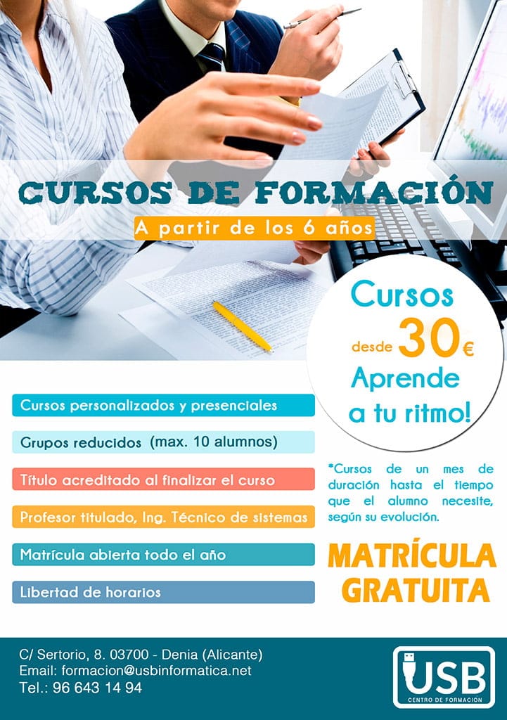 23 de enero de 2018 - 09:50Infórmate de todos sus cursos. Foto Anterior3 de 5Foto SiguienteVer el artículo original: Inscríbete ya a los cursos de informática y nuevas tecnologías en USB Centro de Formación Informática y nuevas tecnologías en USB Centro de Formación usb centro de formacion Cursos de formación USB Centro de Formación Productos USB Centro de Formacion usb-centro-de-formacion-clases-590×394