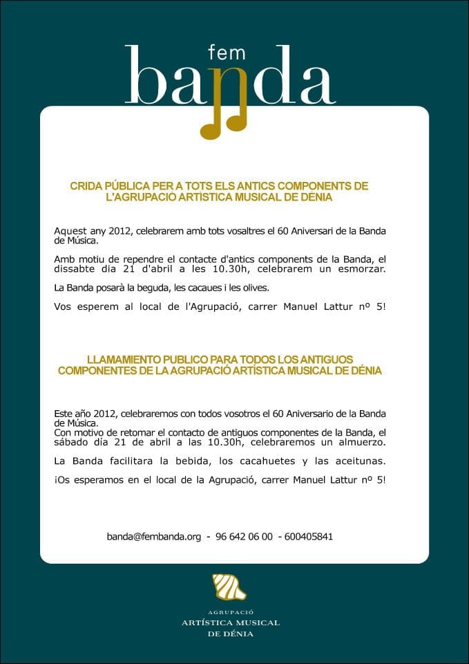 Este año 2012 la Agrupació Artística Musical de Dénia cumple 60 años como formación musical, y para celebrarlo están preparando un amplio programa de actos. Pero también quieren contar con todos los componentes que en algún momento han formado parte de la Banda, y para ello han organizado un almuerzo el próximo domingo 22 de abril a partir de las 10:30 de la mañana en el local de la Agrupación (C/Manuel Lattur).