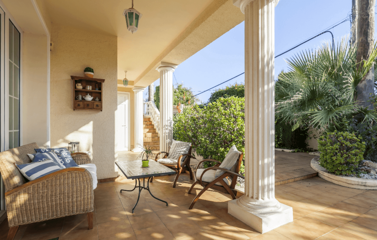 En el exterior de Casa Flamenca, tendrás rincones como este ideales para relajarse, compuesto por un sofá de mimbre de exterior, dos butacas de madera y una mesa de metal.
