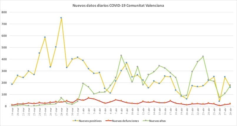 29 de abril de 2020 - 11:16 1 de 1Ver el artículo original: La Comunitat registra un descenso de contagios y aumento de altas diarias Datos coronavirus 28 de abril