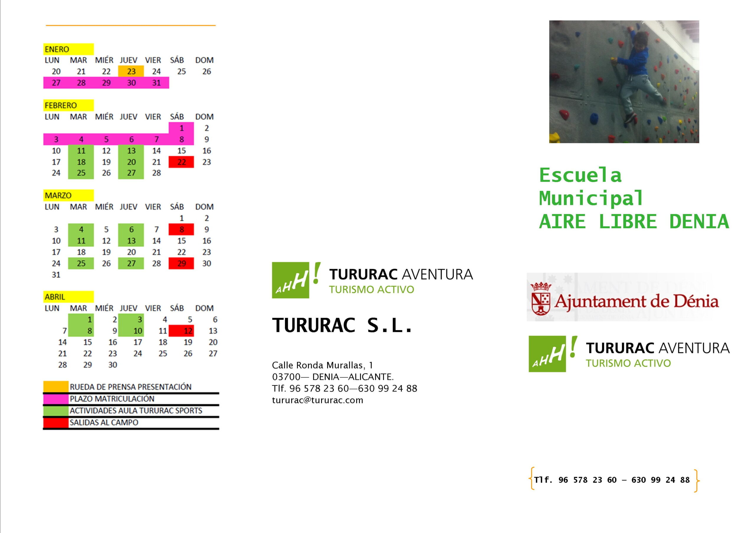 Calendario de actividades de la Escuela Municipal Aire Libre Dénia, iniciativa conjunta del ayuntamiento de Dénia y Tururac.
