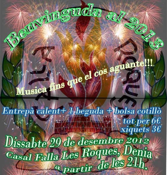 Este sábado 29 de diciembre celebra el fin de año en el casal de La Falla Les Roques. A partir de las 21 horas, bocadillo calentito, bebida y bolsa de cotillón por 6€ los adultos y 3€ los niños ¿que te parece?