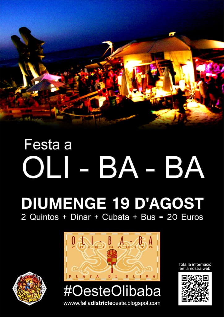 La Falla Oeste organiza para el próximo domingo 19 de Agosto una fiesta en el disco-chiringuito Oli-ba-ba, playa de Oliva. El precio es de 20 euros e incluye: 2 Quintos + Cubata + Comida + Bus. La asistencia a esta fiesta es limitada a 55 plazas, así que la reserva se puede hacer el próximo viernes 10 en nuestro casal, con un depósito de 10 Euros.