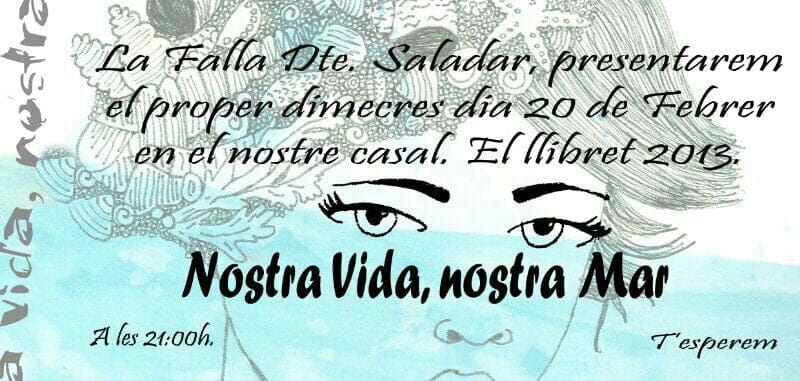 “Nostra vida, nostra mar”, es el título del llibret que la Falla Saladar ha creado para este año 2013. El miércoles 20 de febrero, a las 21 horas, se celebrará la presentación en su casal.