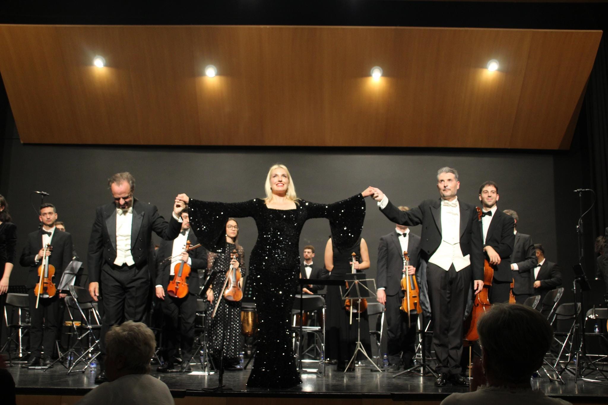 La soprano Irina Avramenko, el tenor Javier Palacios y el director Pere Molina saludan tras la gala en Dénia.