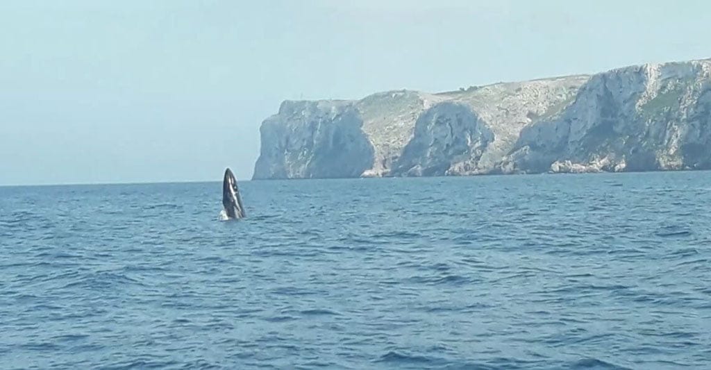 500 metros en direccion N.E. del extremo de la escollera norte,vimos surgir una aleta caudal del agua.Iba en direccion Cullera.Casi sin mover la superficie del agua,que estaba como un espejo,