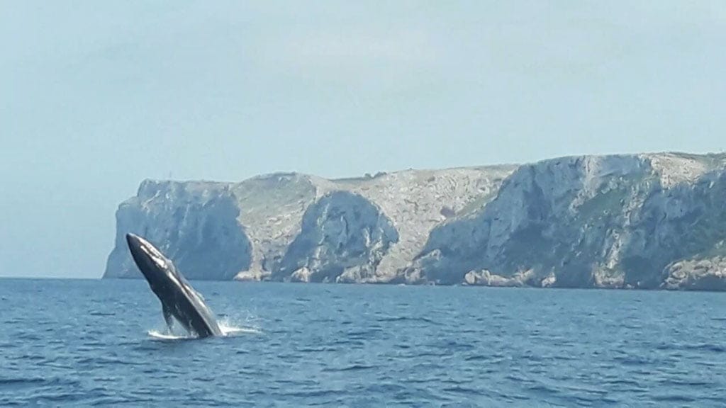 Una embarcación avista los saltos de una ballena rorcual frente al Cabo de San Antonio.