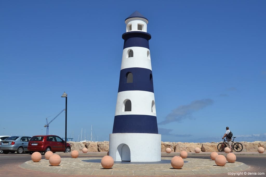 Un faro marinero indica que hemos llegado al final del puerto deportivo Marina de Dénia.