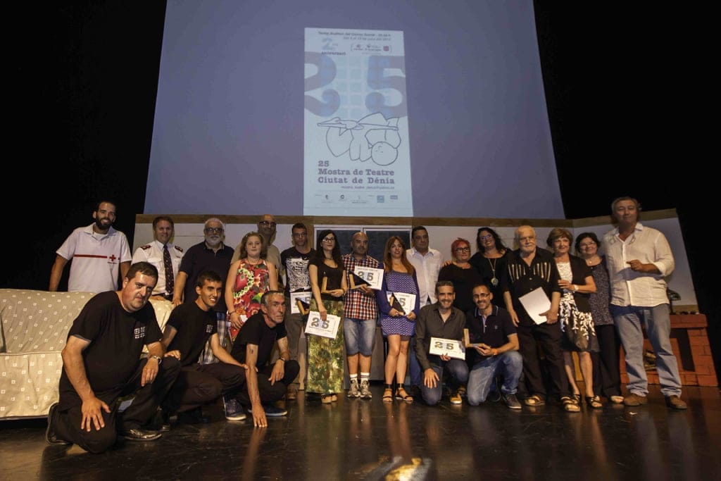 Foto de familia de los ganadores en la 25 Mostra de Teatre Ciutat de Dénia junto al jurado y los organizadores.