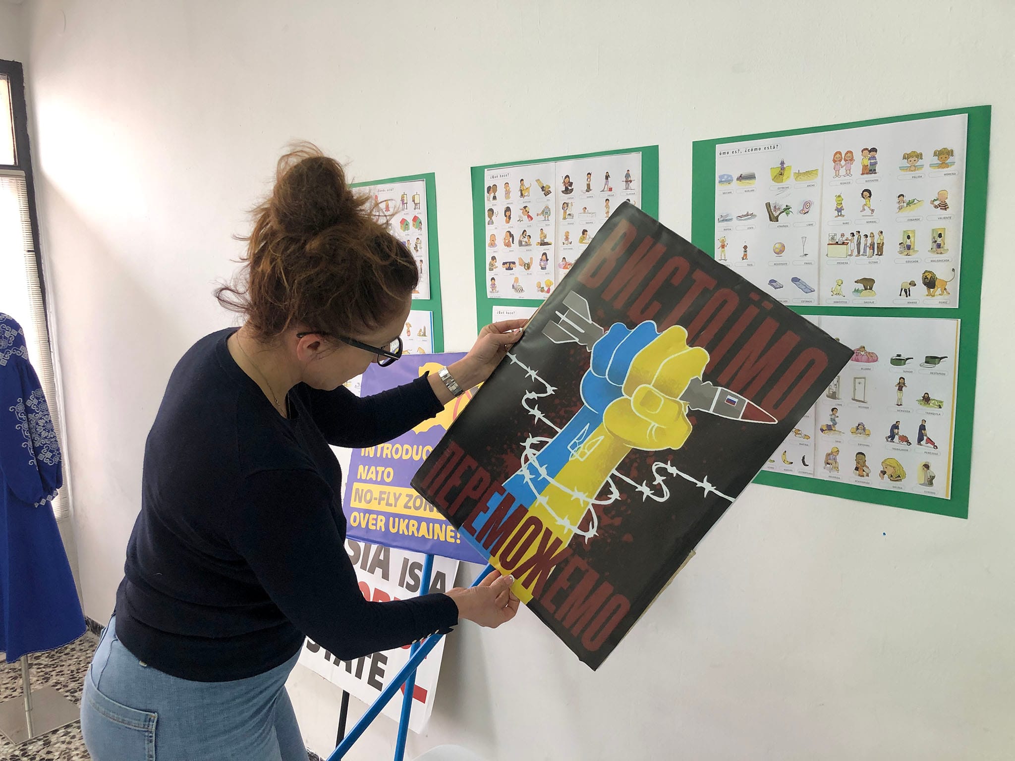 23 de febrero de 2023 - 20:05 Foto Anterior3 de 5Foto SiguienteVer el artículo original: La pequeña Ucrania en Dénia: 365 días de refugio a miles de kilómetros de casa Marianna abandonó junto a sus dos hijas Kiev, donde ejercía de psicóloga, y ahora está a cargo del grupo de apoyo de la asociación Algunos de los bolsos de tela que vende la asociación para recaudar fondos Vira trabajando en las pancartas para la manifestación por los 365 días desde la invasión Cartel de la manifestación convocada para el viernes Voluntarias de la Asociación Ayuda a Ucrania de Dénia trabajando en su sede