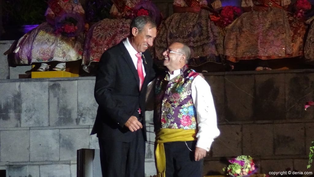 Pleitesía de Paco Arnau, presidente de la Comissió de Festes de la Mare de Déu dels Desemparats, a las falleras mayores de Dénia.