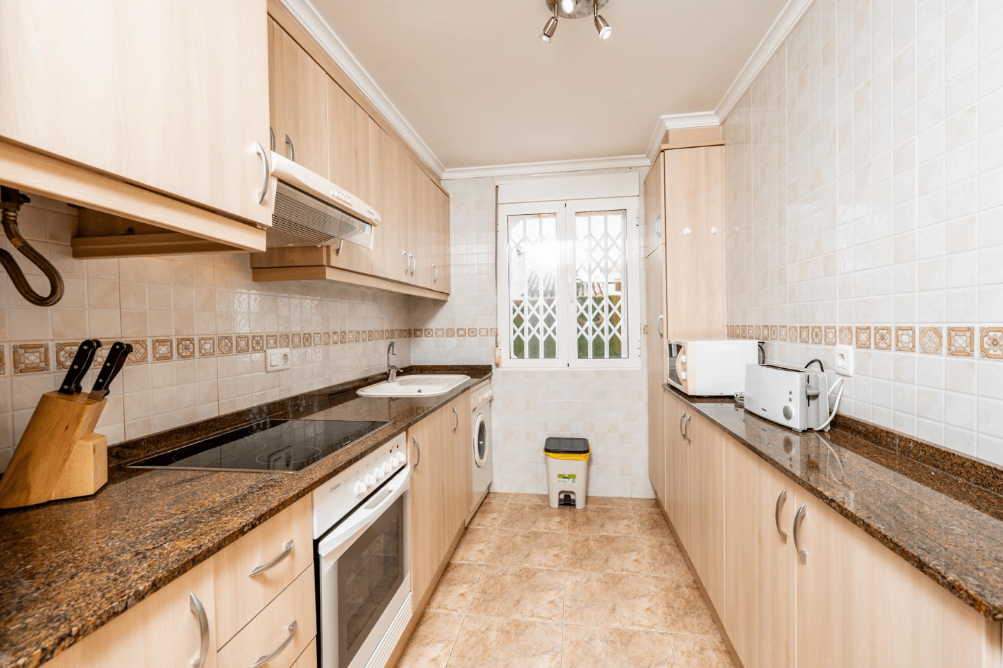 La cocina está completamente equipada, ya que cuenta con electrodomésticos como microondas y lavadora y mucho espacio para almacenaje