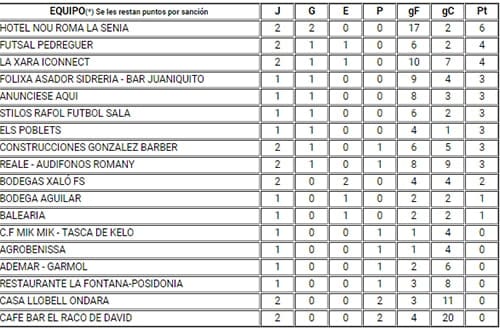 Con dos partidos jugados pero con 4 puntos aparecen, Futsal Pedreguer y La Xara Inconnect. Los pedregueros en esta jornada no pudieron ante el Bodega Xalò pese a jugar en casa. Llevaron el peso del partido ante un rival que supo hacer muy bien las cosas para conseguir un resultado final de empate a uno.