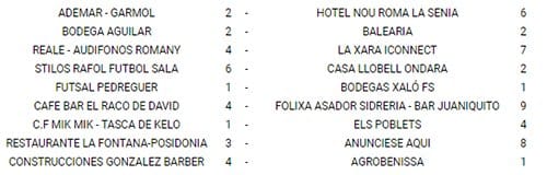 Algunos de los partidos disputados nos dejaron marcadores muy abultados. El choque en el que hubo más goles fue el que enfrentó al Bar El Raco de David y Folixa, que acabó con victoria visitante por 4 a 9.