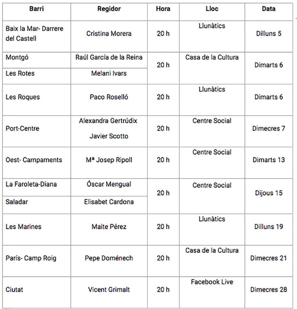 14 de septiembre de 2020 - 13:51 1 de 1Ver el artículo original: Las reuniones con los concejales del barrio volverán a ser presenciales con medidas estrictas Calendario de reuniones de los concejales de barrio